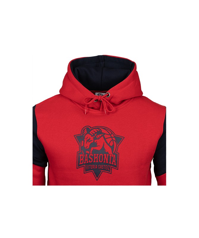 Hoodie de moda con capucha del Baskonia de color rojo con detalles y el escudo en negro en la parte delantera frontal.